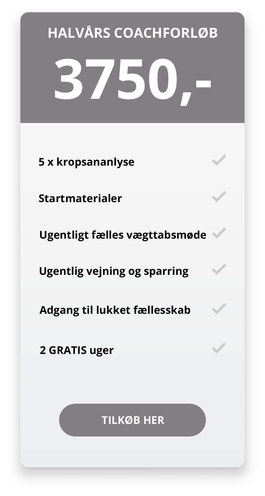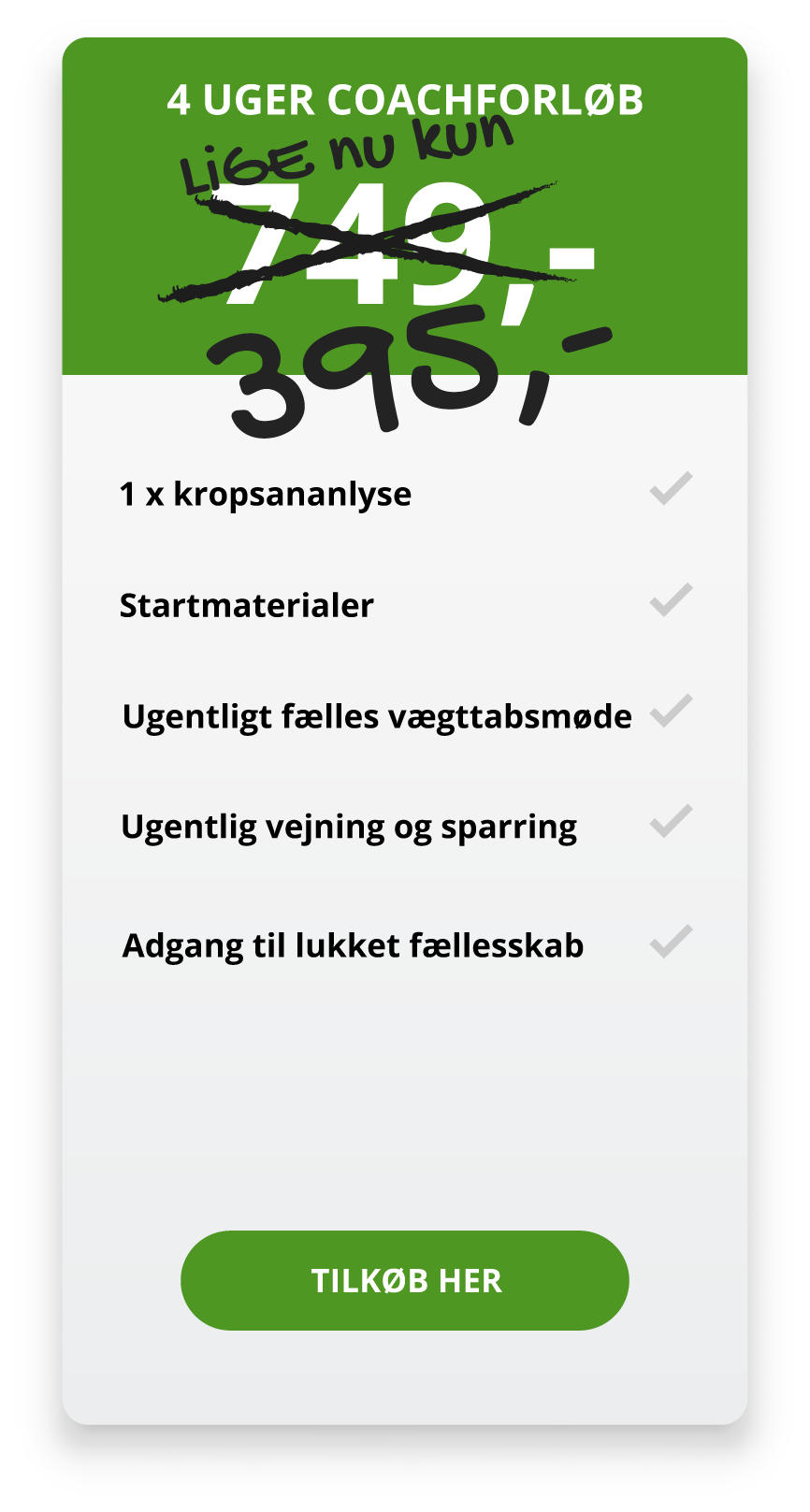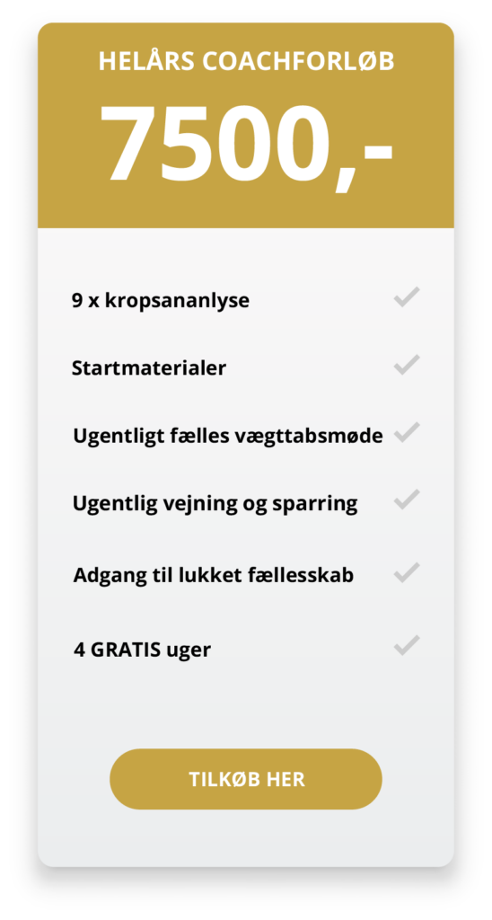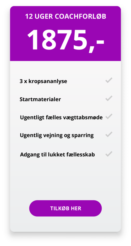 Uanset hvilken løsning du vælger, er du i ugentlig kontakt med din coach, som støtter dig i kost, vaneændringer og vægttab, så du når dine mål på en bæredygtig måde. Samtidig bliver du en del af et stærkt fællesskab med andre, der står i samme situation som dig.
